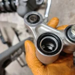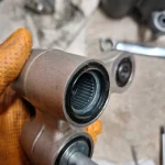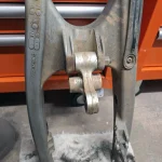 The lower suspension linkage bolt is very rusty and the bearings have a minimal coating of some kind of black grease, possibly graphite. The linkage bolt also retains the mount for the lower chain roller.